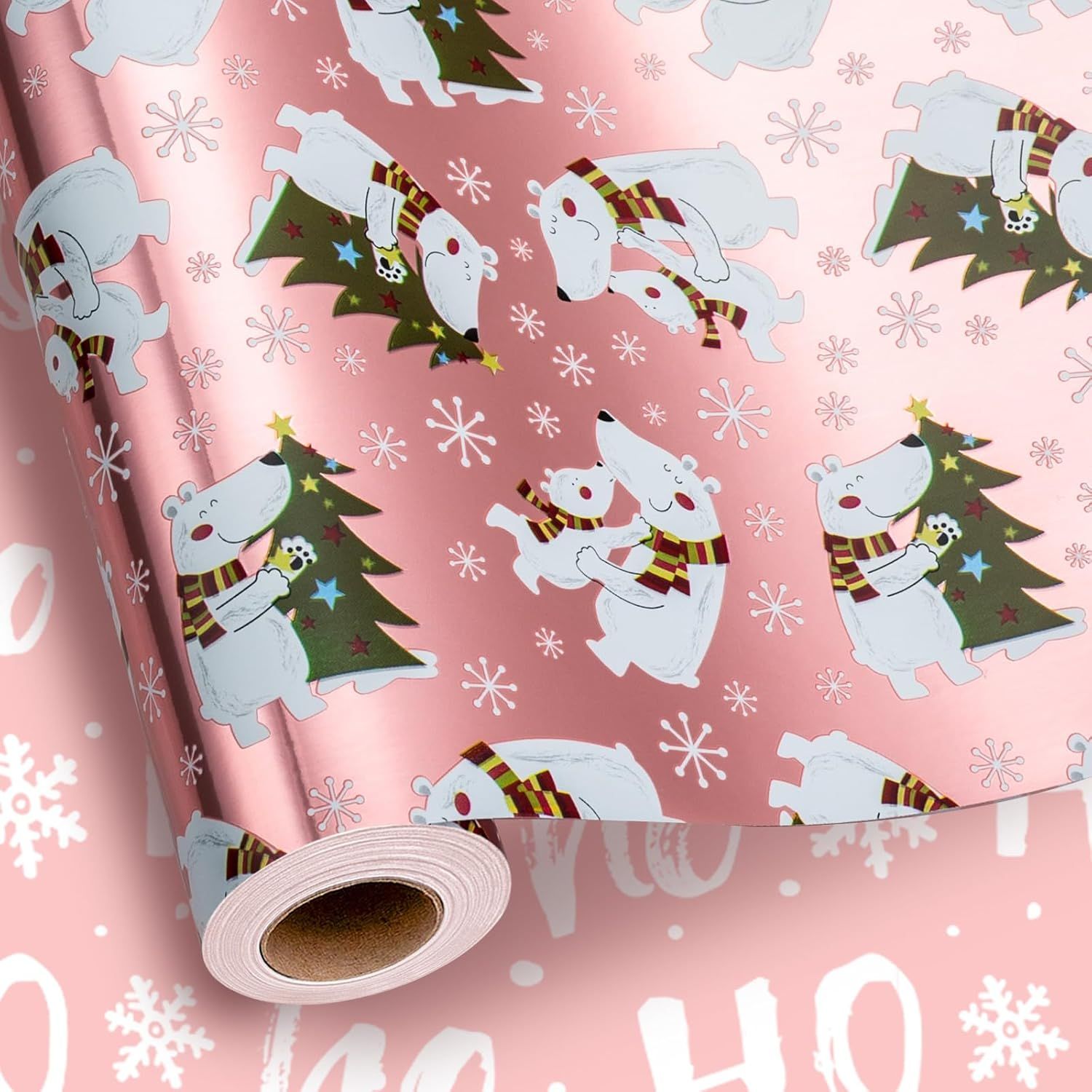 Kids Christmas Wrapping Paper, Pink Wrapping Paper for Girl, Cute Girly Winte Polar Bear Holiday Gift Wrap Metallic Foil Paper for Birthday Baby Shower Festive Decoration (17 Inch X 33 Feet)